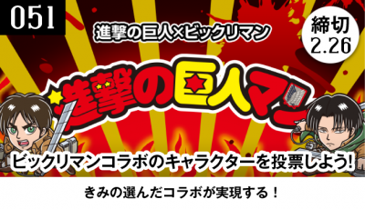 2018.02.16 GOODS 進撃の巨人マンチョコ発売記念企画! あなたが選んだ組み合わせが奇跡のビックリマンシールになるかも!? あなたが選んだ組み合わせが奇跡のビックリマンシールになるかも!? 2/16(金)からビックリマンコラボ キャラクター投票がはじまるゾ! 詳細はこちら→https://mingeki.jp/