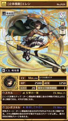 『進撃の巨人』コラボにあわせて、期間中のログインや、決戦イベント「決戦!覚醒の咆哮」などで、梶裕貴さんがキャラクターボイスを担当する神属性激超レアSキャラ「エレン」を獲得可能です。なお、この「エレン(S)」は、合成する闘化素材に応じて闘化後の属性が異なり、神属性以外にすることもできます。