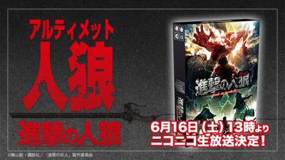 2018.06.12 GOODS 人狼ゲーム『進撃の人狼』のコラボ生放送が決定! 6月16日(土)13時から、ニコニコ生放送『アルティメット人狼チャンネル』にて、『進撃の巨人』の世界観を もとにした人狼ゲーム『進撃の人狼』のコラボ生放送が決定! 『進撃の巨人』を愛する人狼プレイヤーたちのステージを見逃すな! 詳細はこちら http://live.nicovideo.jp/gate/lv313660103