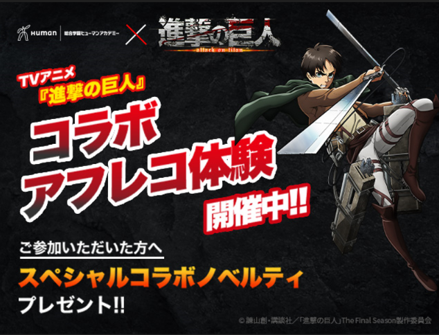 ヒューマンアカデミーパフォーミングアーツカレッジにて『進撃の巨人』アニメ映像を使用したアフレコ体験を開催いたします。