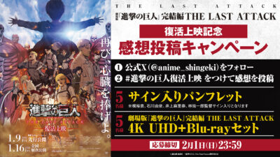 「進撃の巨人」公式X(@anime_shingeki)をフォロー、#進撃の巨人復活上映 をつけて感想をXにて投稿した中から抽選でサイン入りパンフレット他豪華景品プレゼント!