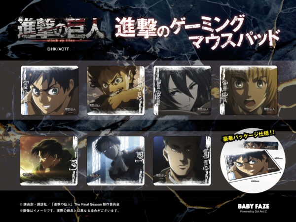 2026.02.02 GOODS BABY FAZEから 「進撃のゲーミングマウスパッド」発売! 『進撃のゲーミングマウスパッド』が7種の絵柄で下記URLより発売開始! 調査兵団達の美麗な昇華転写印刷にマウスの使用感を両立した奇跡の仕様。 ゲームに限らず一般使用も可の最高品質のゲーミングマウスパッドです。 ▼詳細はこちら https://babyfazegaming.shop https://dotandz.shop